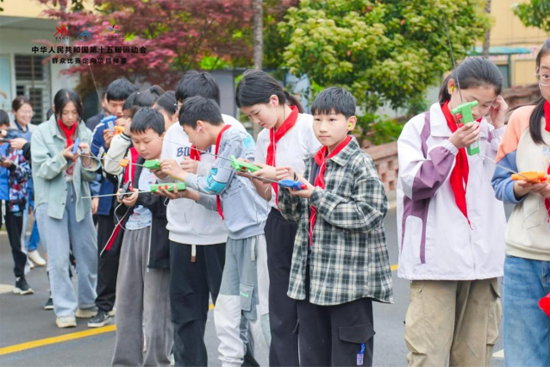 4月11日上午,第十五届全运会群众比赛定向项目预赛无线电测向公益体验活动在湖北省襄阳市襄城区卧龙镇迴龙小学赛场举行,20余名小学生参与其中。