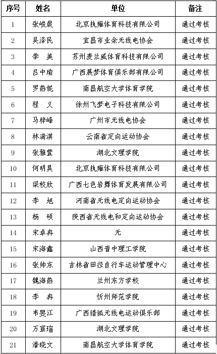 2025年10月13日至17日,由体育总局航管中心、中国无线电和定向运动协会主办,国家体育总局安阳航空运动学校承办的2025年全国无线电测向初级教练员培训班在河南举办,现将通过考核人员名单公布如下: