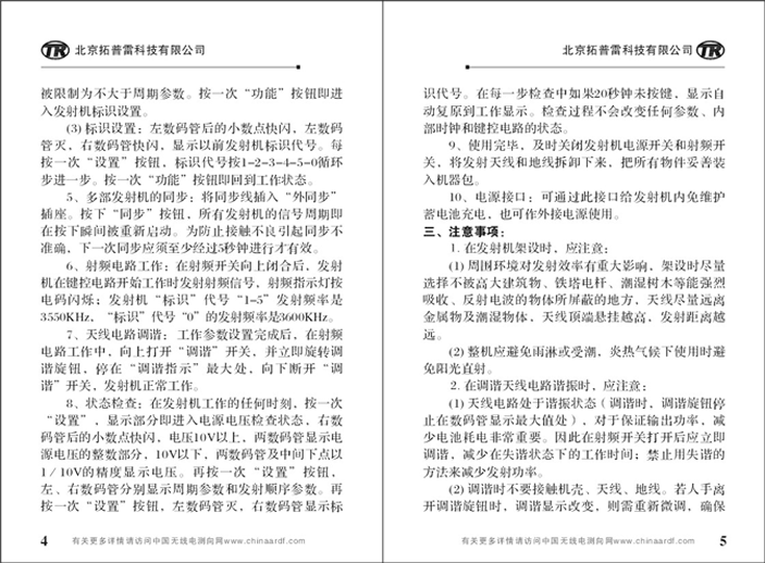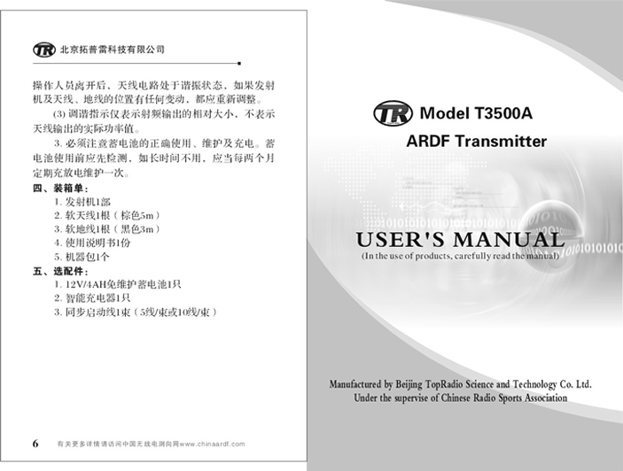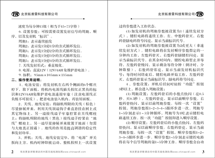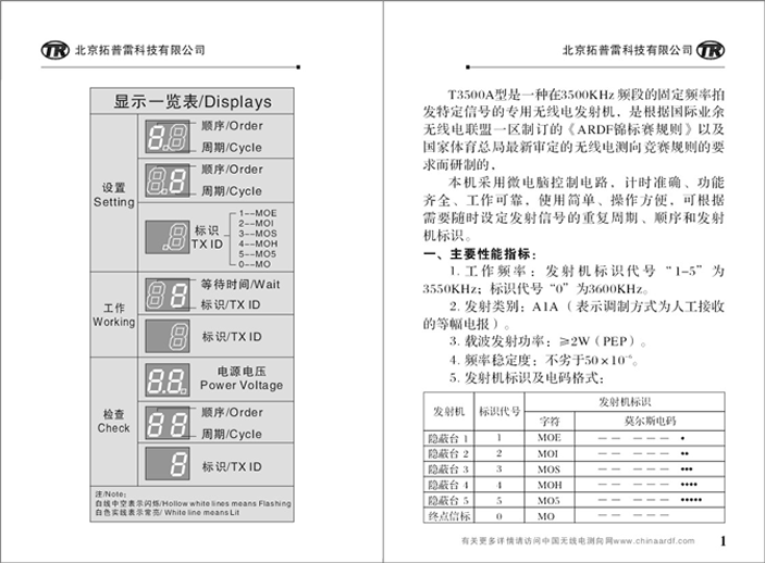 用于标准距离80米波段无线电测向运动。隐蔽台(1-5号)发射频率为3.55MHz,信标台发射频率为3.6MHz,载波发射功率≥2W,电码键控载波发射,外接电源DC12V,符合国际ARDF规则和全国锦标赛规则要求。
